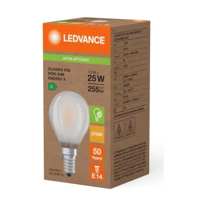 La lampada Ledvance LED Classic E14 Pera Filamento Ghiaccio 1.2W 255lm - 827 Bianco Molto Caldo | Sostitutiva 25W è il sostituto perfetto per le tue vecchie lampade 25W con attacco a vite piccolo E14 grazie alla sua tecnologia LED. Passare a LED ti offrirà molti vantaggi!