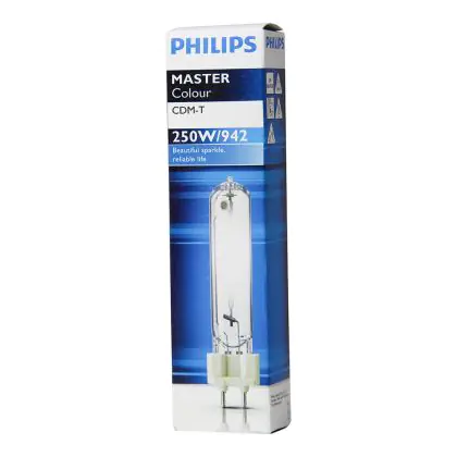 Le Philips CDM-T 250W 942 G12 (MASTERColour) sono lampade a scarica compatte da 250W con base G12 che emettono una luce brillante assicurando colori stabili per tutto l'arco della loro vita, pari a 6300 ore. Ció che le contraddistingue é l'alta intensità del flusso luminoso che raggiunge un livello pari a 22000 lumen. Queste lampade integrano la tecnologia UV-Block che consente di limitare lo scolorimento degli oggetti illuminati. L'indice di resa cromatica di queste lampade a scarica assume un valore di 90-100Ra, il che indica un'ottimale esaltazione delle caratteristiche dell'oggetto illuminato.