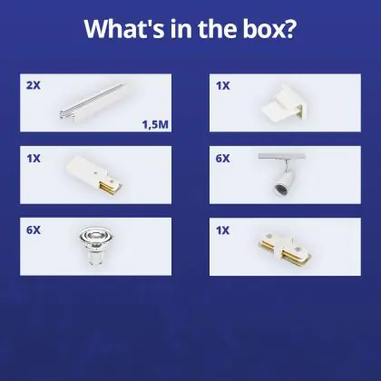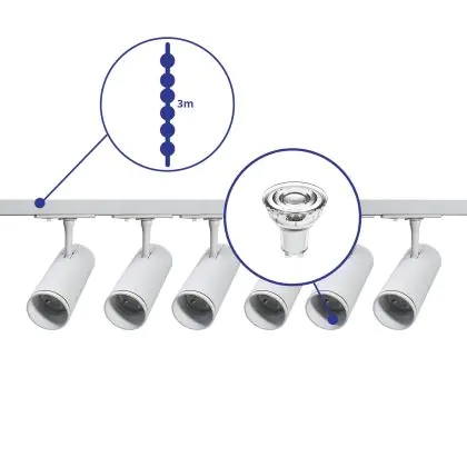 Descrizione Set completo 1-Fase Rail 3 Metro Bianca | incl. 6x Faretti + GU10 2700K 3W Dimmerabile + Tappo Di Chiusura, Connettore di Alimentazione e I-Connettore