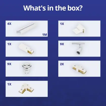 | Nome del fabbricante | Complete L shaped 1-Phase Track Set White incl. 9x Spot fixture + GU10 2700K 3W Dim – 2 x 2 meter i | |